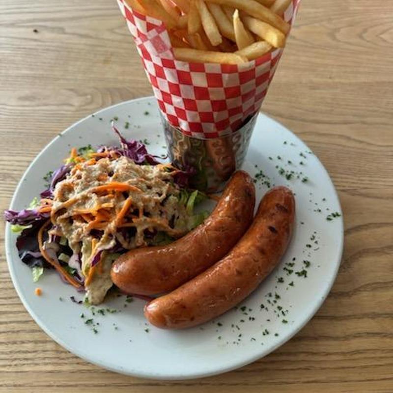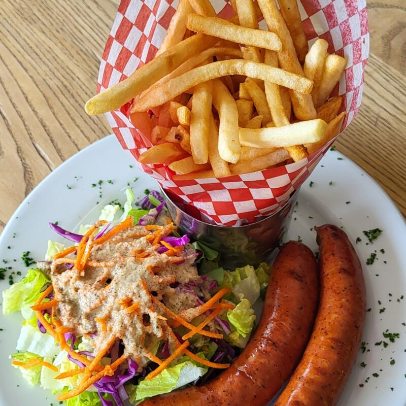 Two Smoked Pork Hungarian Style Garlic Paprika Sausages paired with Fries and our Haus Green Salad