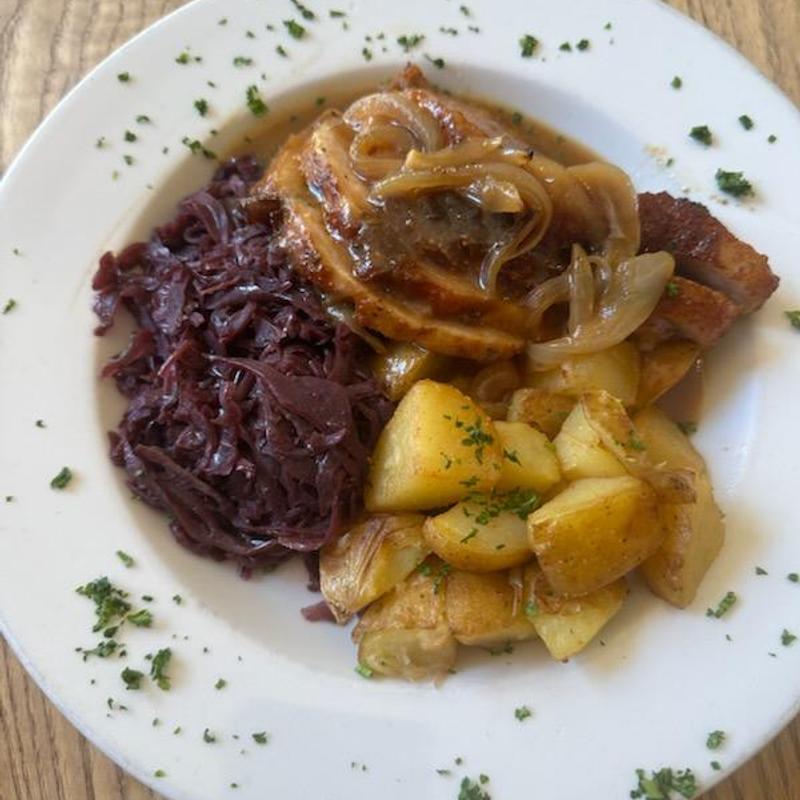 Slow Roasted Pork Tenderloin filled with Prunes paired with Roasted Potatoes and Red Cabbage topped with Sautéed Onions and a Dark Bier Gravy