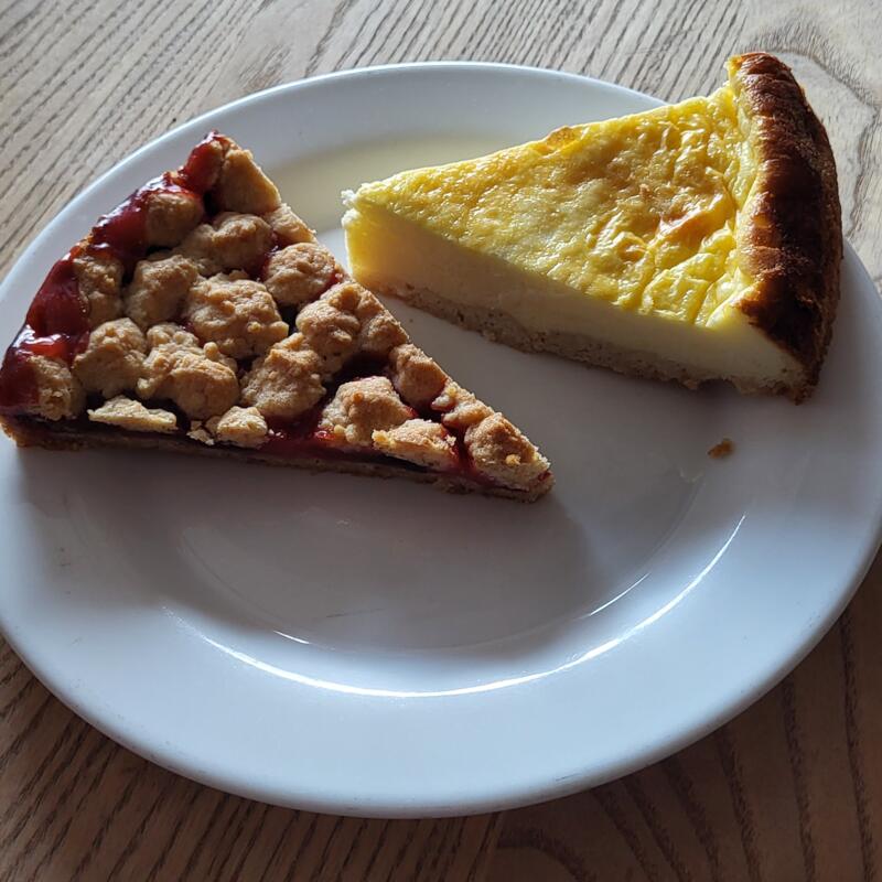 A slice of the original owner's delicious German style Cheesecake or Weekly Rotating Fruit Cake