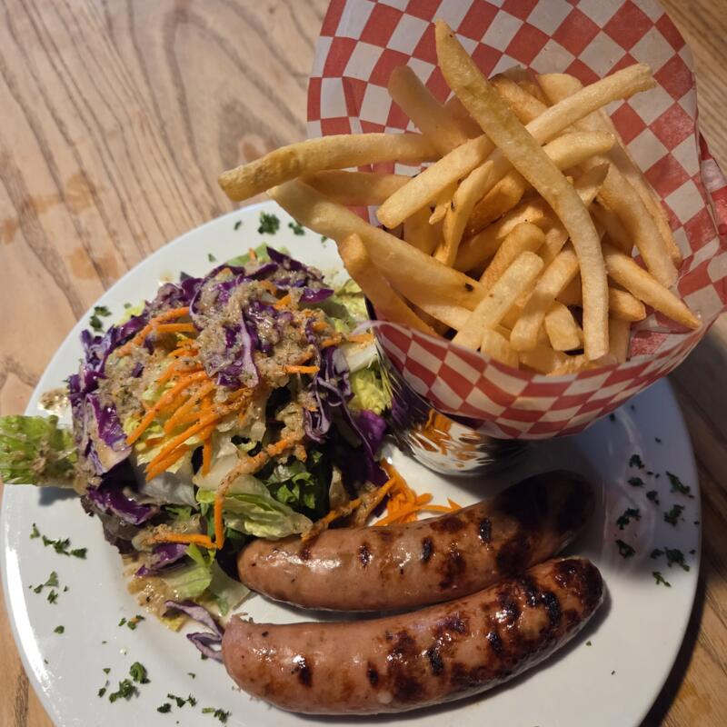 Two Chicken Sausages paired with Fries and our Haus Green Salad