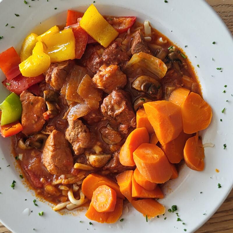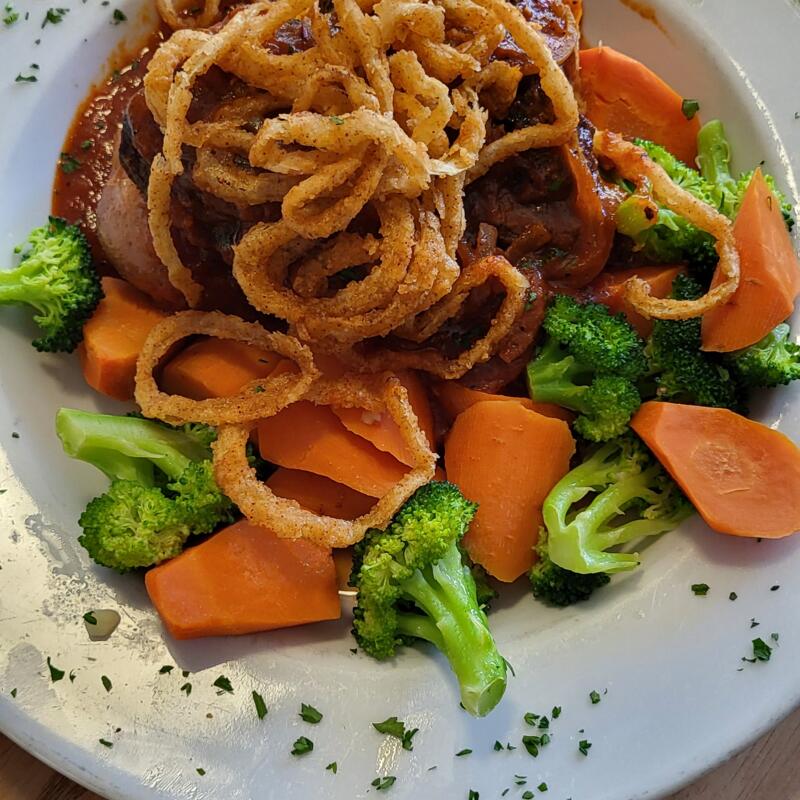 Slow Roasted Beef Sirloin paired with Braised Potatoes, Steamed Broccoli and Carrots, topped with Crispy Onions and a Rich Spicy Onion-Tomato Sauce