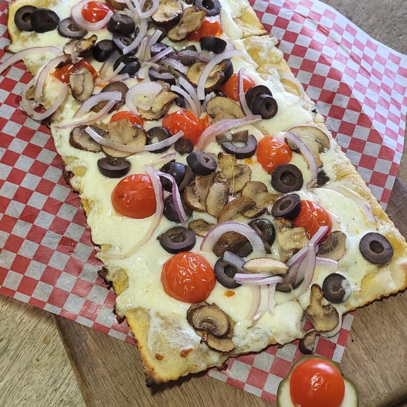 Flatbread with Creme Fraiche, Mozzarella, Mushrooms, Red Onions, Cherry Tomatoes and Black Olives